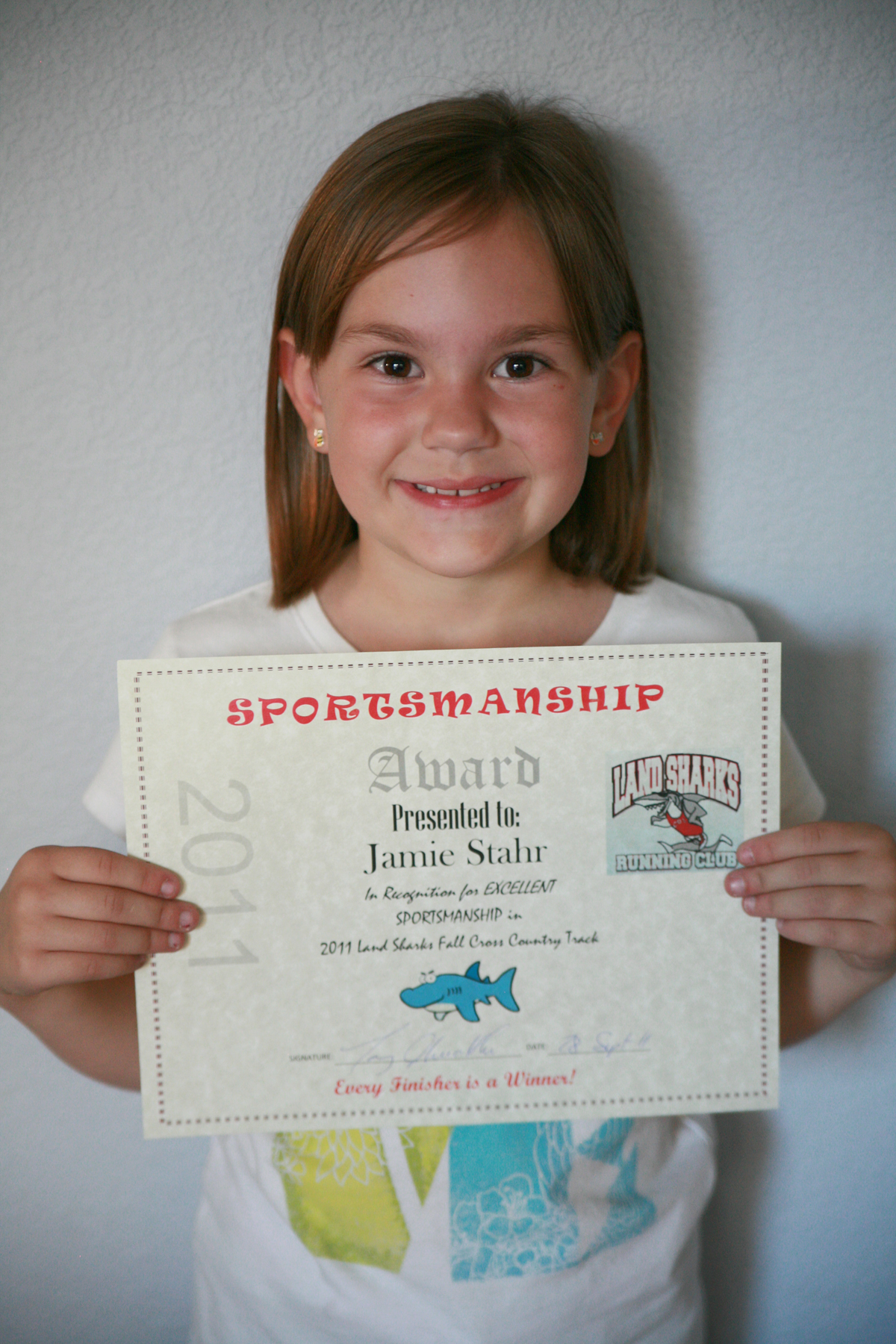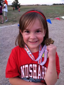 Next, Jamie finished Landsharks this week. Her last cross-country race was successful. She finished 57 seconds faster than her previous race! That’s a 13:52 for 1 1/4 miles! She was so proud to get her medal…