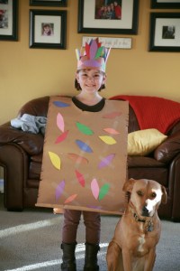 What a cute Indian! Love the costume. Also like your house – the blue and the red could not match any better! My Thanksgiving feast menu looks almost identical – have a great holiday. Love to all!
