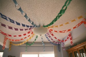 5. Jacob scolded me for standing on a bar stool while attaching the rainbow to the wall/ceiling. He said that I should be using the step-ladder. I had to explain that I couldn’t reach while standing on the ladder. He said, “Oh yeah, you are kind of short.” Then he told me that if I fall it he was going to say, “I told you so” because he did. I didn’t fall so we are good!