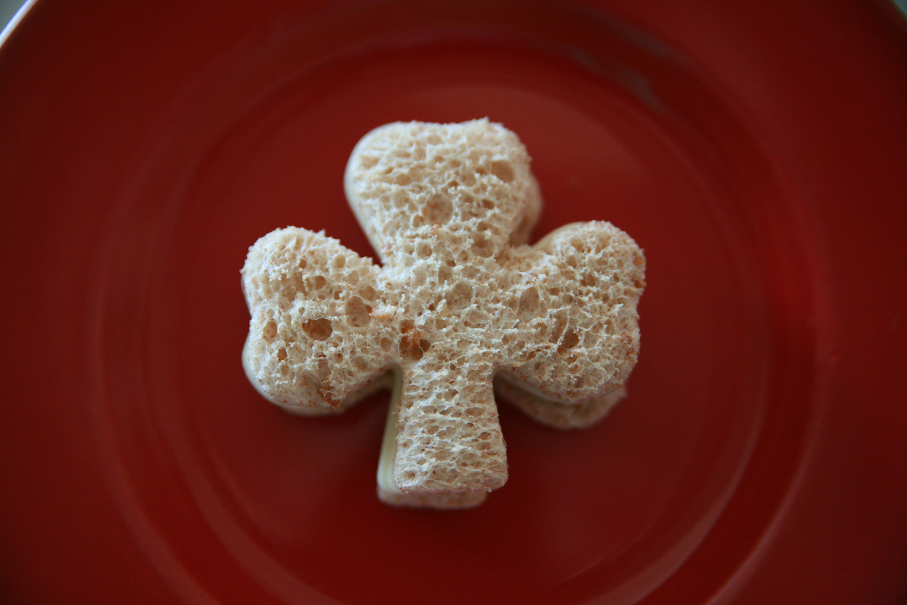 I mean, Jacob does love green and the girls get a kick out of four-leaf clovers and such. So this is what we had for lunch. Shamrock sandwiches (with or without tomato) and Granny Smith apple slices (not pictured)…