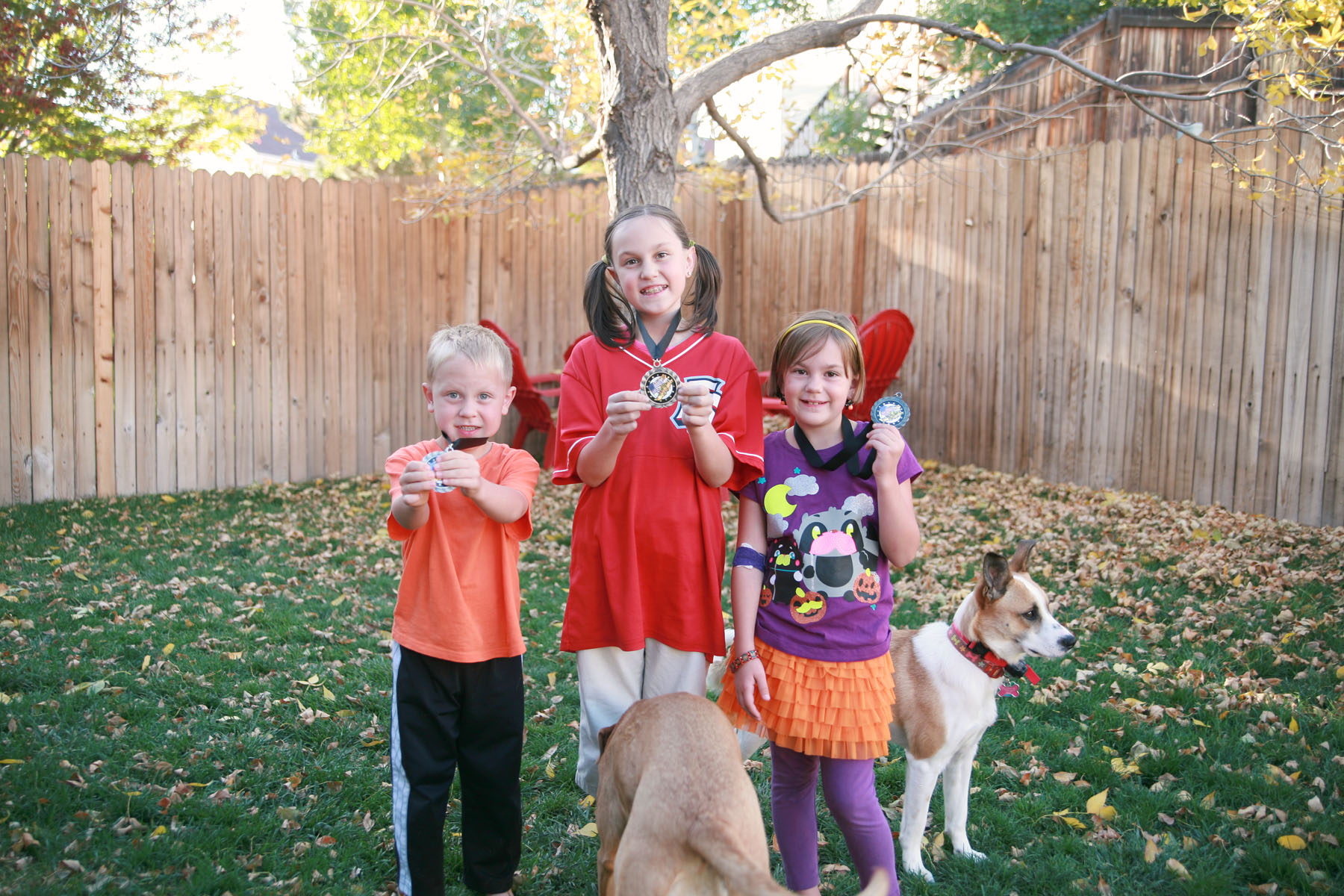 2. I’m going to start with Landsharks. The kids did the Fall XC series. There was a 1/2 mile division (Jacob), 1 mile division (Jamie), and a 1 1/2 mile division (Mazie). They ran their hearts out each week and had a blast but Jacob has already said he likes the short sprint series in the Spring better. I’m guessing he’s not going to be much of a distance runner! But here they are, proud as can be with their medals. Even the dogs joined in the fun…