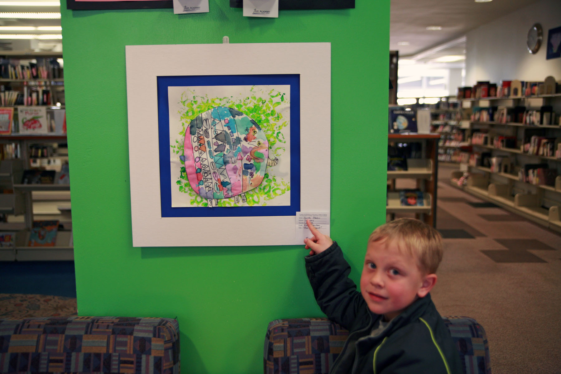Next up, was Jacob’s big art project. The art teacher at school was able to submit 3 works of art per grade to the District 49 art show. Jacob’s was one of them. And so his artwork went on display downtown at the Penrose library. We took a little trip there this weekend to see it displayed with all the others. He was a little proud of his art…