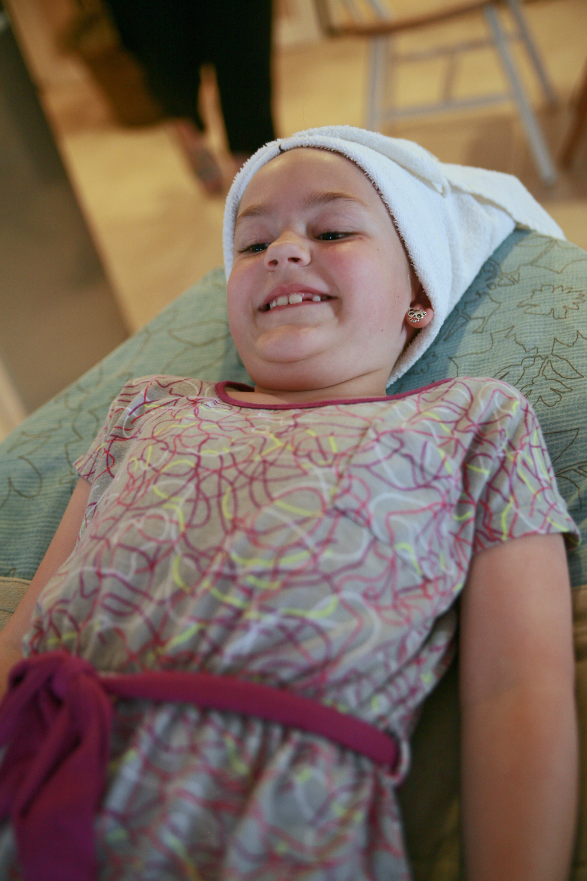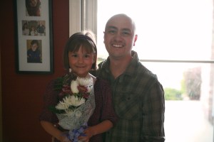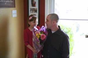 Dad picked her up with pretty purple and white flowers…