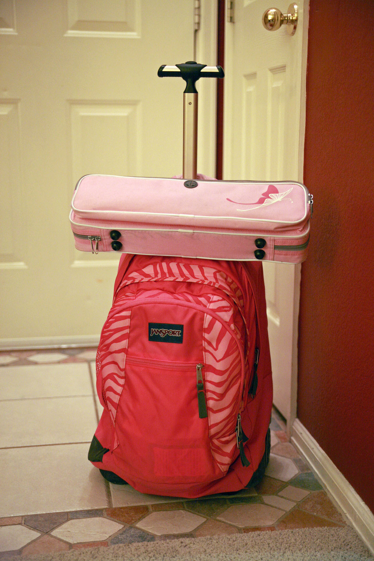 Day 27: Mazie’s backpack, which conveniently rolls since she refuses to keep any of her books in her locker and weighs more than she does, and flute bag ready for school tomorrow. She keeps it by the front door.