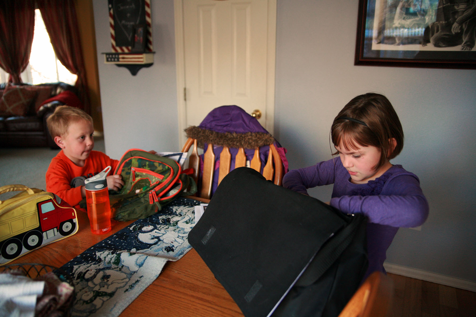 Day 28: After school craziness…Jamie and Jacob unloading all their goodies from school and then packing their snacks and lunches for the next day.